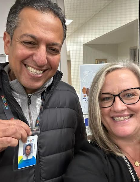 Originally from Saudi Arabia, Mohamed R. worked in Human Resources and Logistics before moving to the United States with his wife and four children. In Saudi Arabia, men typically do not work in kitchens, but Mohamed embraced the skills he developed through the Café Work Experience Course. Those skills helped him secure a job within the SoWashCo School District. He proudly posed with Adult Programs Supervisor Susie Evans to celebrate his new role and ID badge.